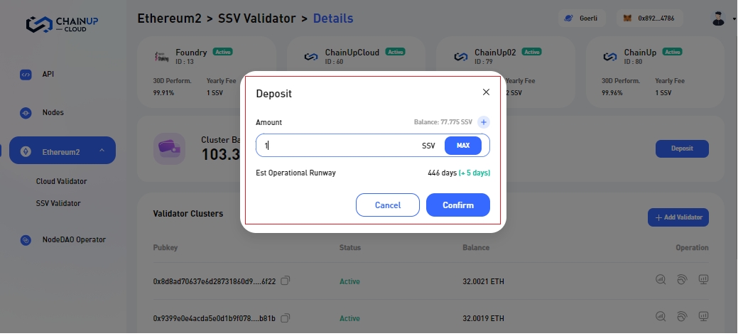 Step 3: Enter the amount of SSV you want to deposit into the selected cluster. Ensure that your MetaMask wallet has sufficient funds. Then, click the 'Confirm' button.