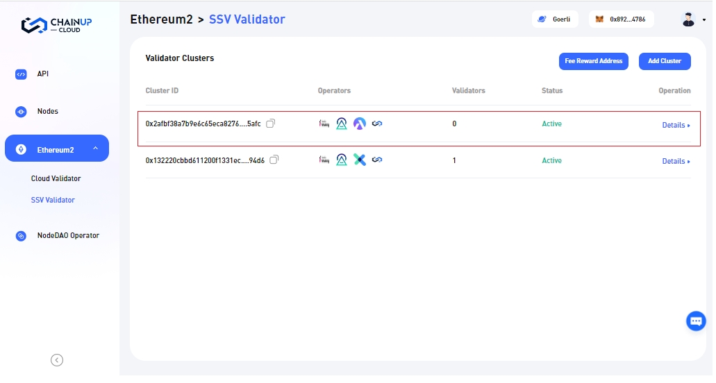 Step 1: After logging into ChainUp Cloud, navigate to the Ethereum2 dropdown menu. Here, you'll find a summary of available validator clusters. Click on the specific cluster you wish to delegate/deposit to.
