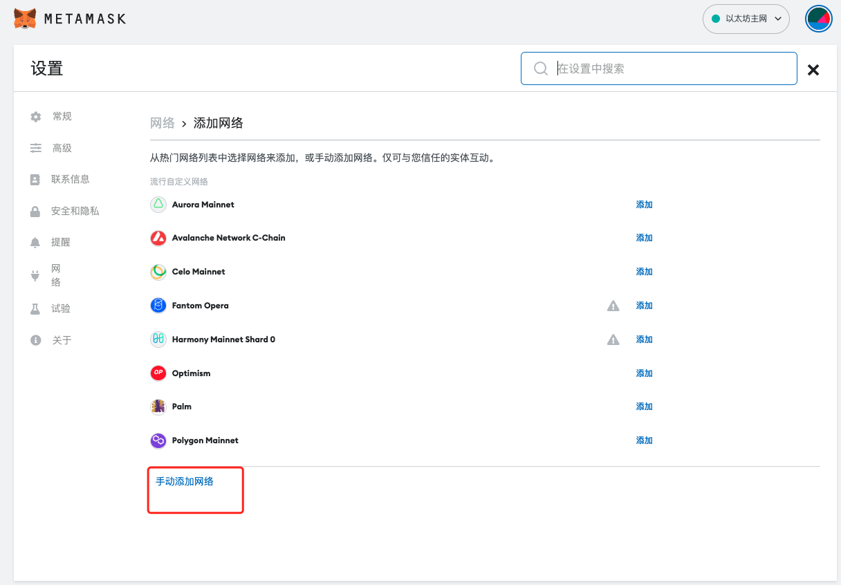 **The steps to add the main chain information in MetaMask are as follows:** 在MetaMask中添加主链信息步骤如下：