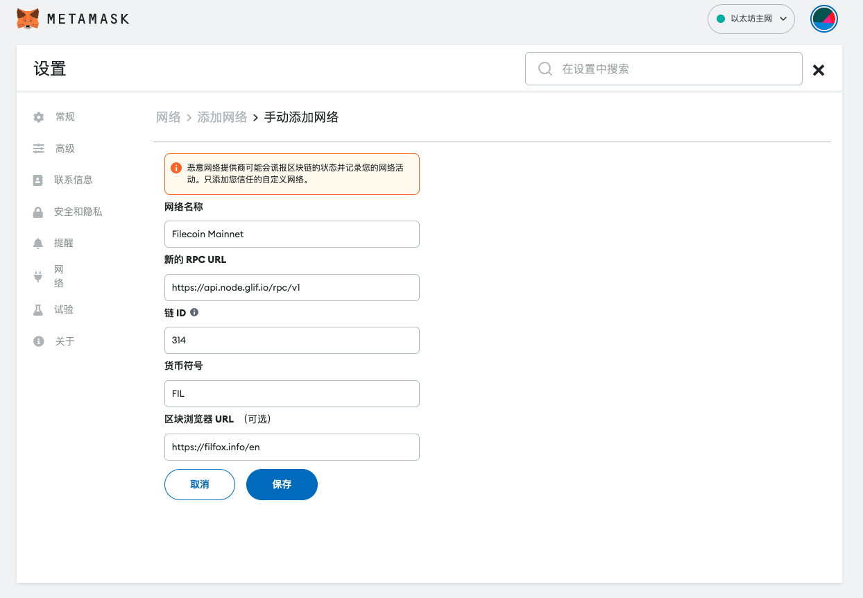 ### 2 . Add the FIL chain to the MetaMask plugin 2.将FIL链添加到MetaMask插件