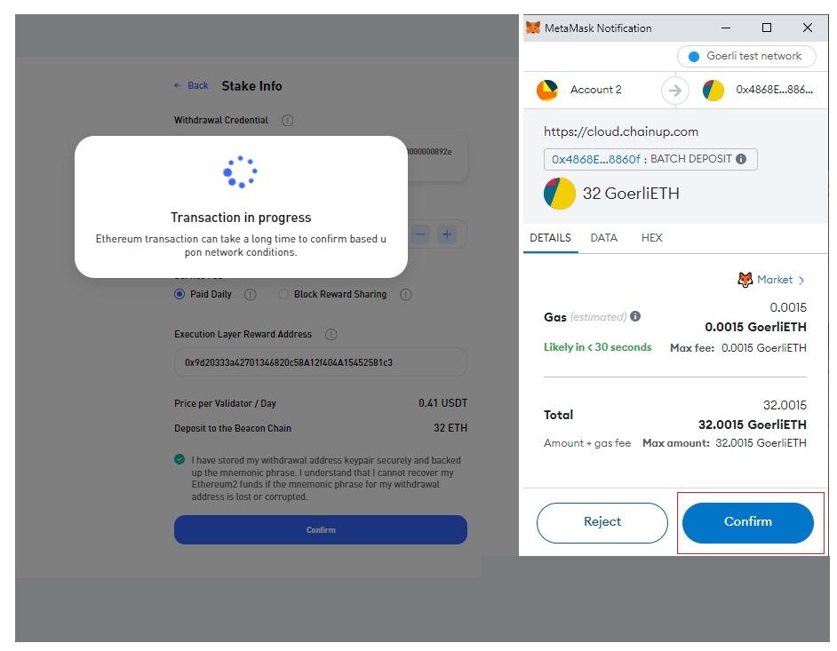 c. 确认: - 等待成功存款交易的确认。 - 确认后,您的资金将被质押,您的验证器将处于活动状态。
